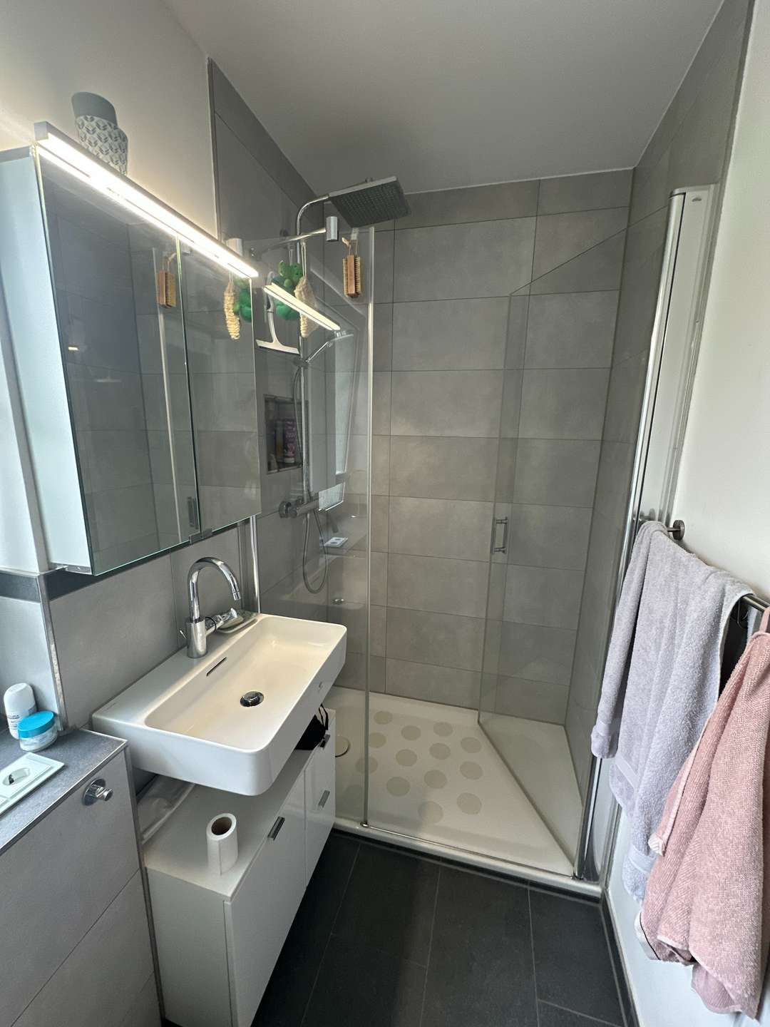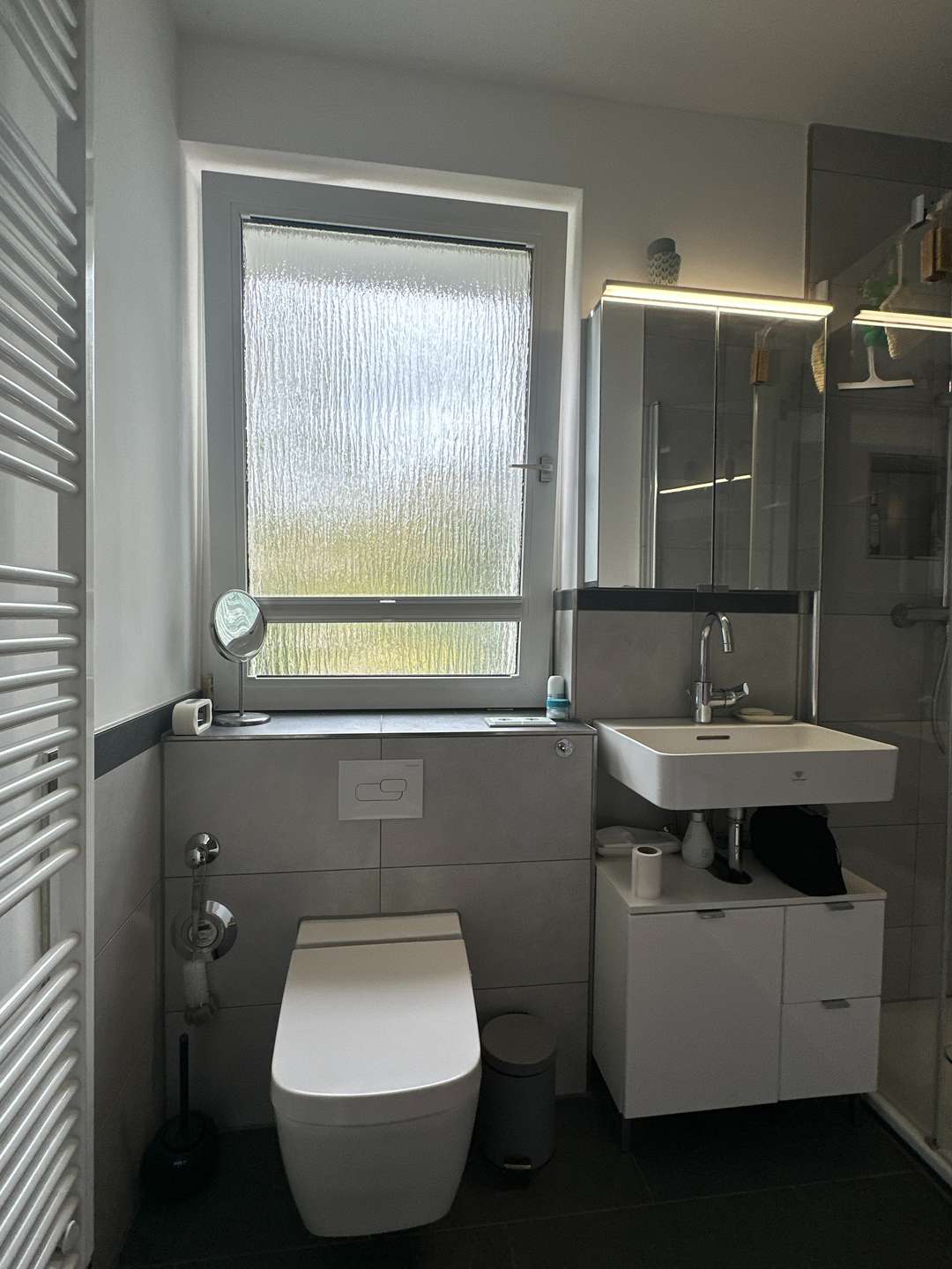 Das Badezimmer ist modern gestaltet und verfügt über ein großes Fenster, einen Handtuchheizkörper, ein hängendes WC mit integriertem Warmwasser-Bidet und eine bodentiefe Duschwanne mit Regendusche. Helle Fliesen und moderne Armaturen verleihen dem Raum einen frischen und hochwertigen Charakter.