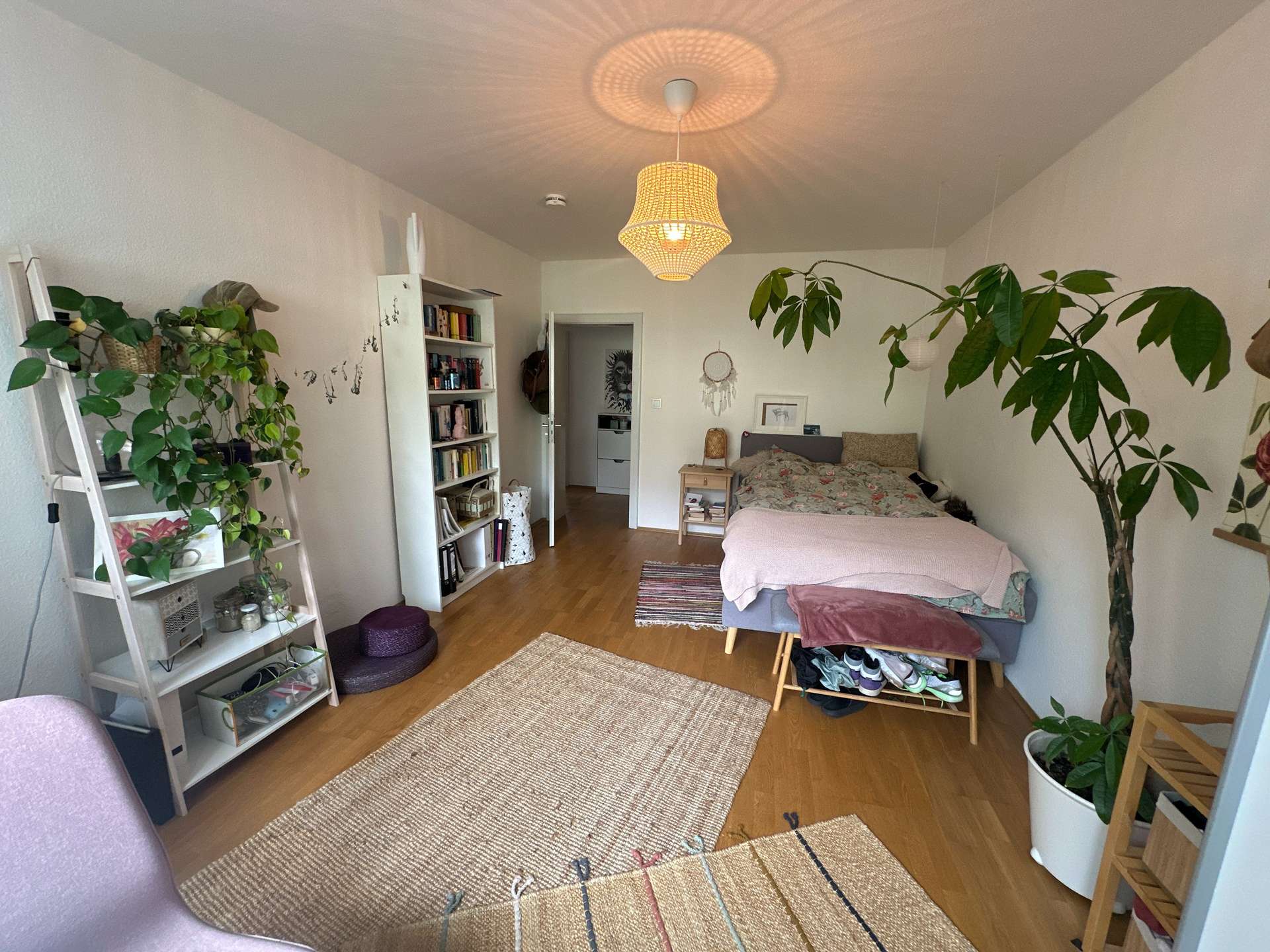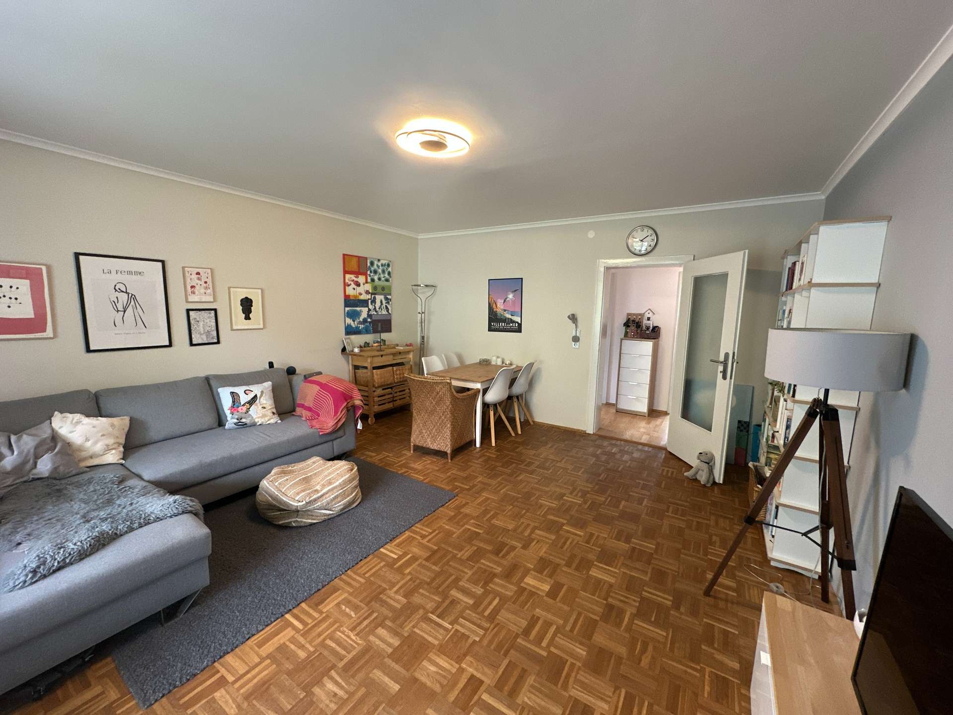 Das Wohnzimmer liegt auf der Westseite der Wohnung und ist mit schönem Mosaikparkett ausgestattet. Es bietet Zugang zum Balkon, der mit seiner Größe und dem Blick ins Grüne ein echtes Highlight darstellt. In den Nachmittagsstunden scheint hier angenehm die Sonne und schafft eine entspannte Atmosphäre.