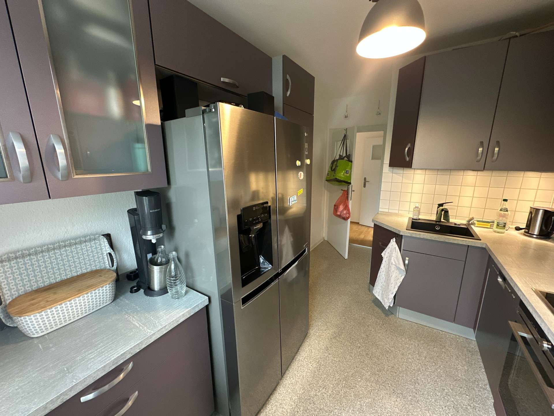 Die Küche ist ebenfalls sehr ansprechend ausgestattet. Sie bietet hochwertige Geräte, einen großen Vorratsschrank und einen geräumigen Kühlschrank mit zwei Türen. Der Vinylboden passt harmonisch zur übrigen Ausstattung, und ein Fenster sorgt für ausreichend Tageslicht.