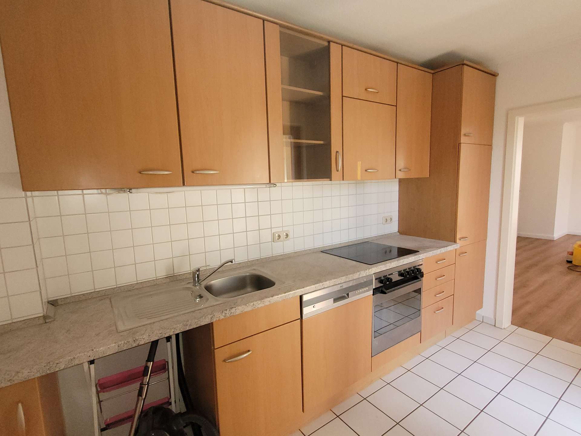 Die Küche ist mit einer Einbauküche ausgestattet und hat ebenfalls einen Zugang zum Balkon. Zusätzlich steht ein praktischer Abstellraum innerhalb der Wohnung zur Verfügung.