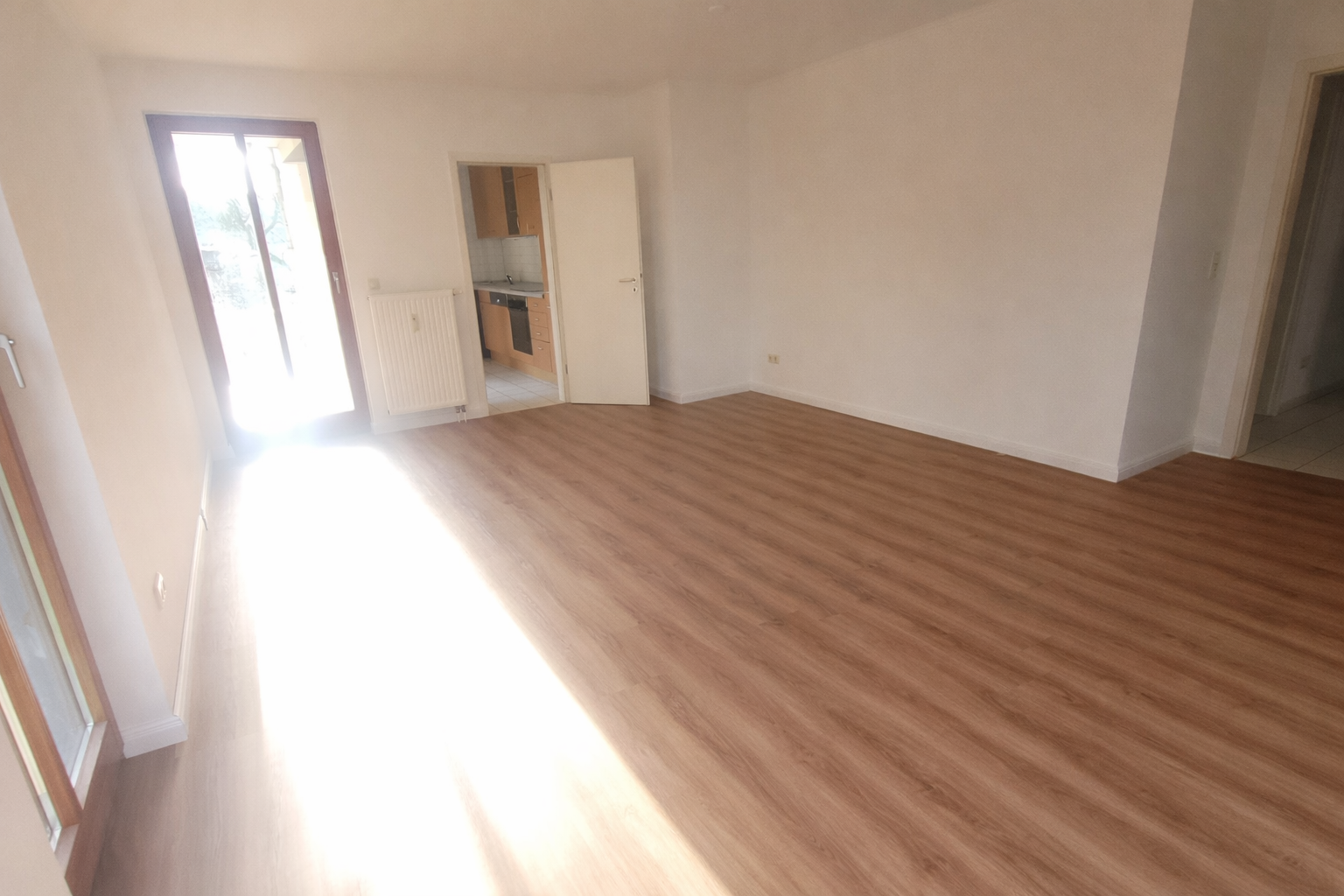 Die Wohnung teilt sich in zwei Zimmer auf: ein gemütliches Schlafzimmer sowie ein großzügiges, lichtdurchflutetes Wohnzimmer mit Zugang zum Balkon. Beide Räume überzeugen durch ihre Helligkeit und den neuen, modernen Vinylboden, der in der gesamten Wohnung verlegt wurde.