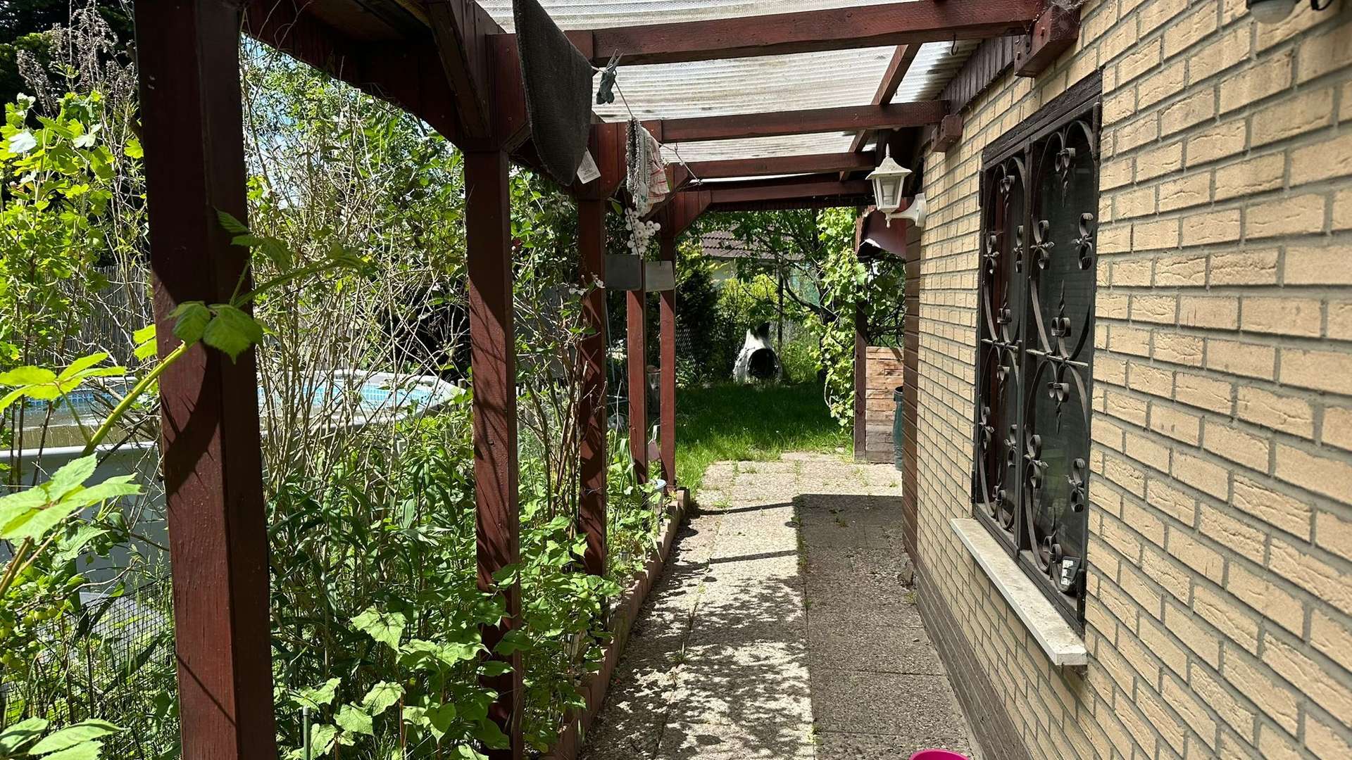 Das rund 339 m² große Eigentumsgrundstück verfügt über mehrere Bestandsbauten: eine massiv gemauerte Gartenlaube (Baujahr 1987) mit einer Wohnfläche von etwa 25 m², ein Blockhaus aus Holz sowie ein weiteres kleines Bauwerk, das derzeit als Werkstatt genutzt wird. Die Hauptlaube umfasst einen Wohnbereich, eine Einbauküche, ein Gäste-WC mit Tageslicht sowie einen gemütlichen Schlafbereich. Ein Kamin sorgt für behagliche Wärme an kühleren Tagen.
