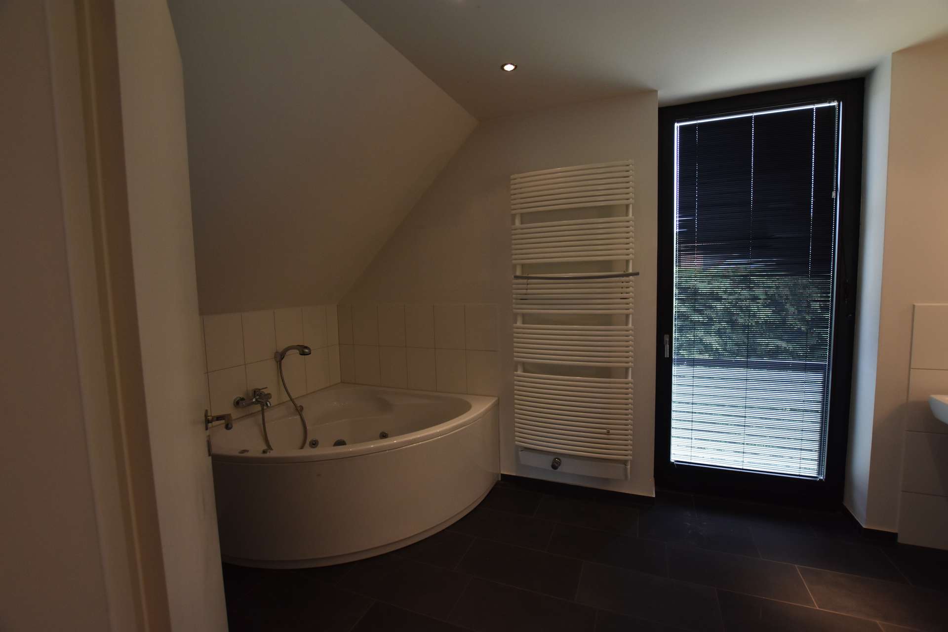- Elegantes Badezimmer mit Eckbadewanne, Dusche und Doppelwaschtisch