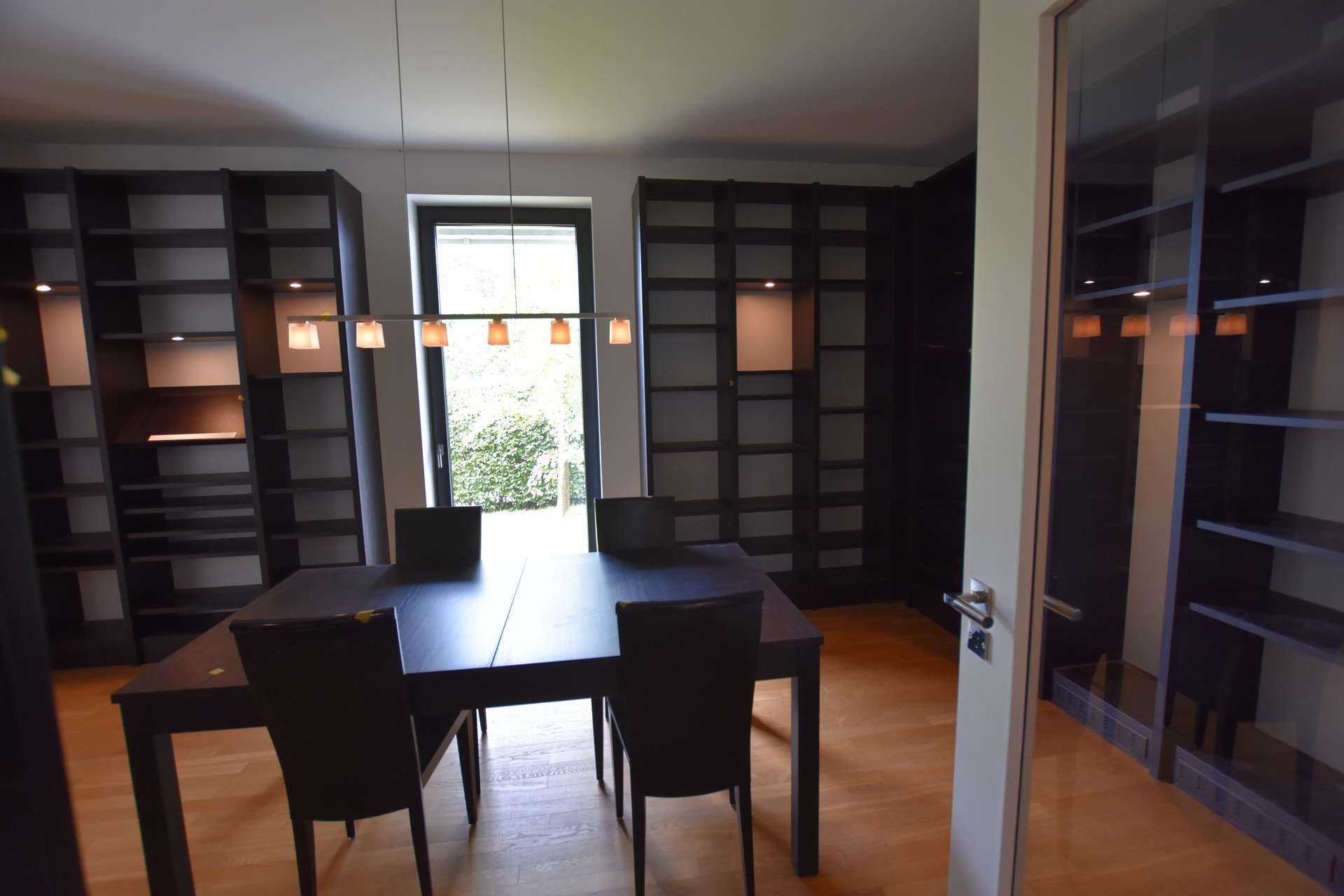 Im Erdgeschoss befindet sich der einladende Empfangsbereich, der direkt in den weitläufigen Wohn- und Essbereich übergeht. Große Fensterflächen sorgen hier für ein angenehmes, lichtdurchflutetes Ambiente und schaffen fließende Übergänge zwischen Innen- und Außenraum. Die angrenzende Küche mit hochwertiger Einbauküche bietet ausreichend Platz für gemeinsame Kochmomente und geht harmonisch in den Essbereich über. Ergänzt wird diese Etage durch ein stilvolles Gäste-Bad sowie eine gemütliche Bibliothek, die zum Verweilen einlädt.