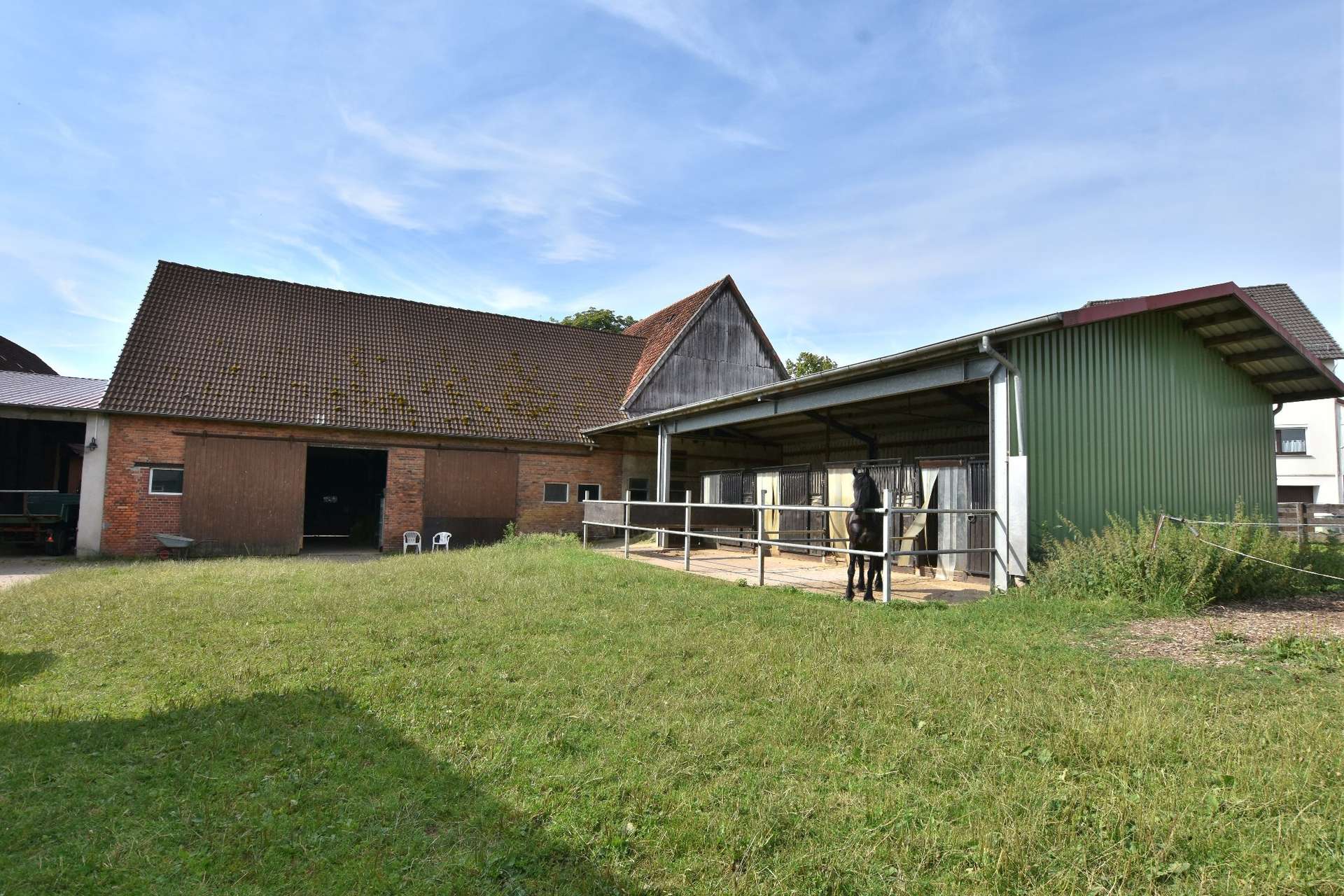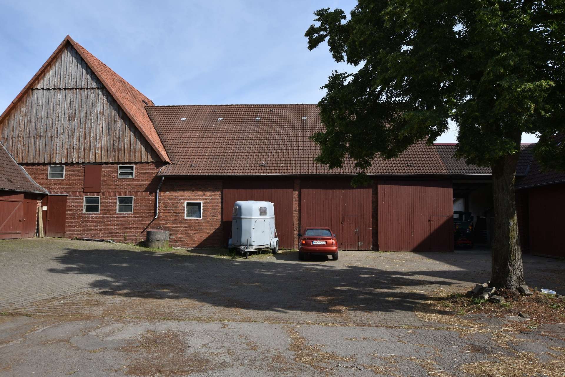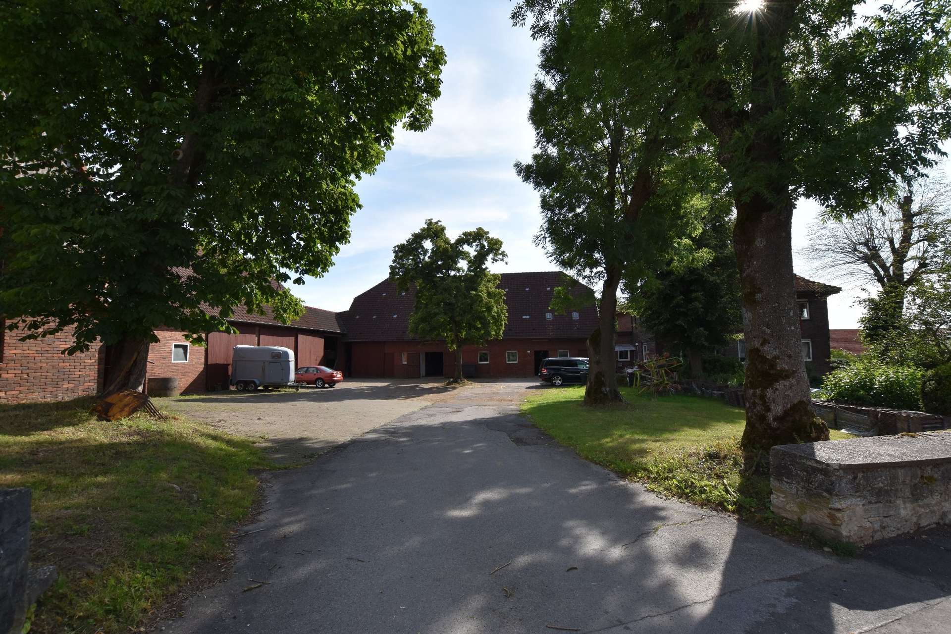 eine mit alten Bäumen bestückten zentralen Hofzufahrt. Auf der rechten Seite befindet sich das nahezu quadratische Haus in der Form einer „Kaffemühle“, wie dieser Gebäudetyp mit 2 geraden Etagen und einem Dachgeschoß im Norden liebevoll tituliert wird. Das Haus wird umgarnt durch einen schönen parkähnlichen Naturgarten. Hinter dem durch einen Laubbaum geprägten Rondell thront das Stallgebäude mit ca. 10 Pferdeboxen als zentraler Baukörper zwischen Wohnhaus und der sich links anschließenden Scheune. Sowohl das Wohnhaus als auch das Stallgebäude fielen einem Feuer zum Opfer und wurden daher 1933 im gleichen zusammenhängenden Stil neu errichtet. Die Scheune von 1948 auf der linken Seite beherbergt 8 Pferdeboxen und nimmt sowohl Stroh als auch Heuballen zu Lagerzwecken auf. Ein großes Raumvolumen ohne Zwischendecke sorgt für gute Luft für die Pferde.