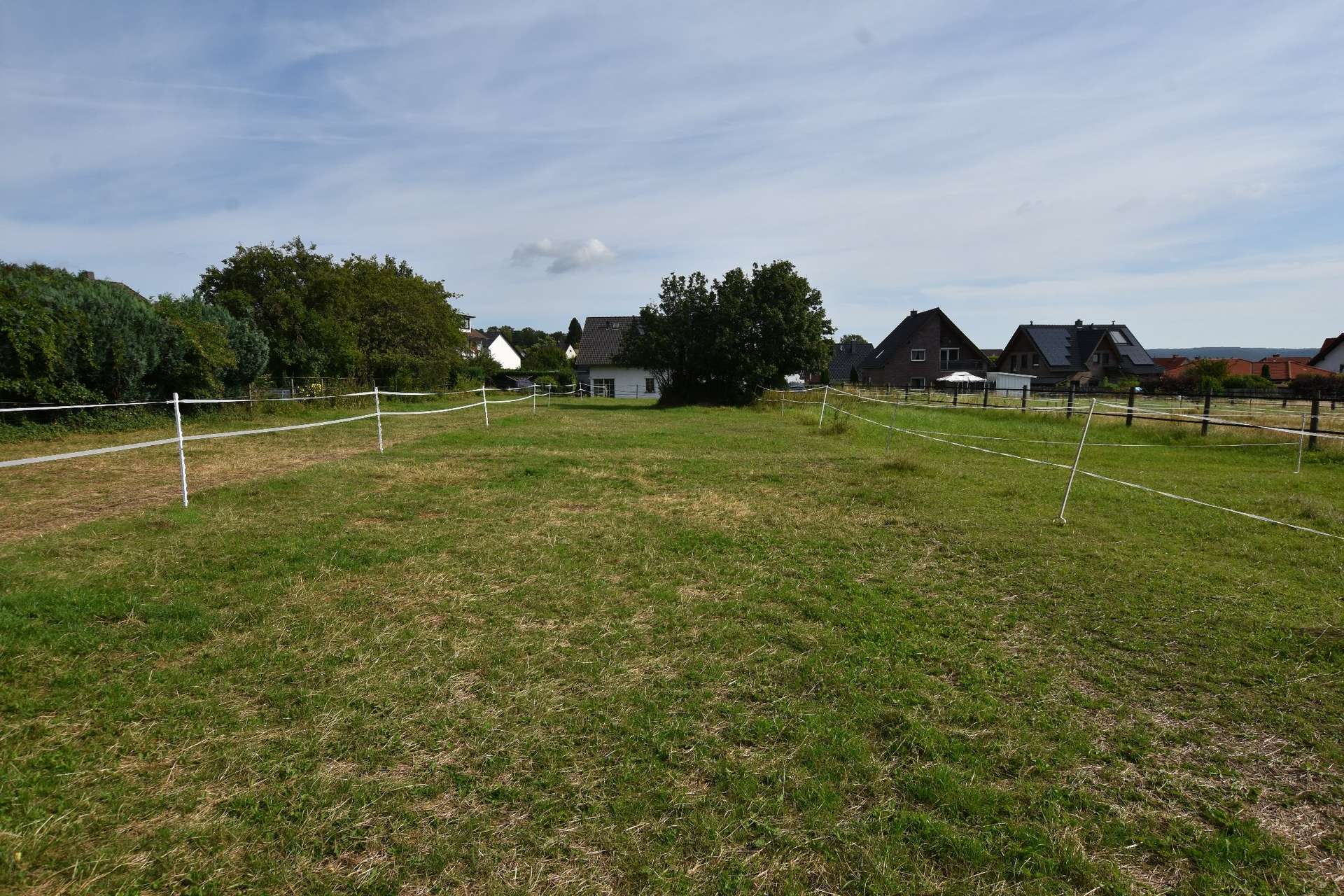 Verschiedene Außenpaddocks, Einzelweiden, Abstellbereiche für landwirtschaftliches Gerät und natürlich die Pferdedung Lagerstätte finden Platz auf dem Hinterhof. Ein Steinwurf von der Reithalle entfernt schließen sich dann noch Pferdeweiden an, die an zwei Seiten bereits umringt sind von fortschreitender Bebauung mit modernen Wohnhäusern. Das Gelände der Pferdeweiden ist Bauerwartungsland. Es könnte vom zukünftigen Erwerber dieser Nutzung zugeführt oder gar ganz aus dem Kaufvertrag ausgeklammert werden. Das reduziert auf der einen Seite natürlich das Gesamtpreisengagement; auf der anderen Seite müsste man ggf. auf alternative Weidefläche in 5 minütiger Fußmarschlänge ausweichen. Es gibt verschiedentliche Verwendungsmöglichkeiten dieser