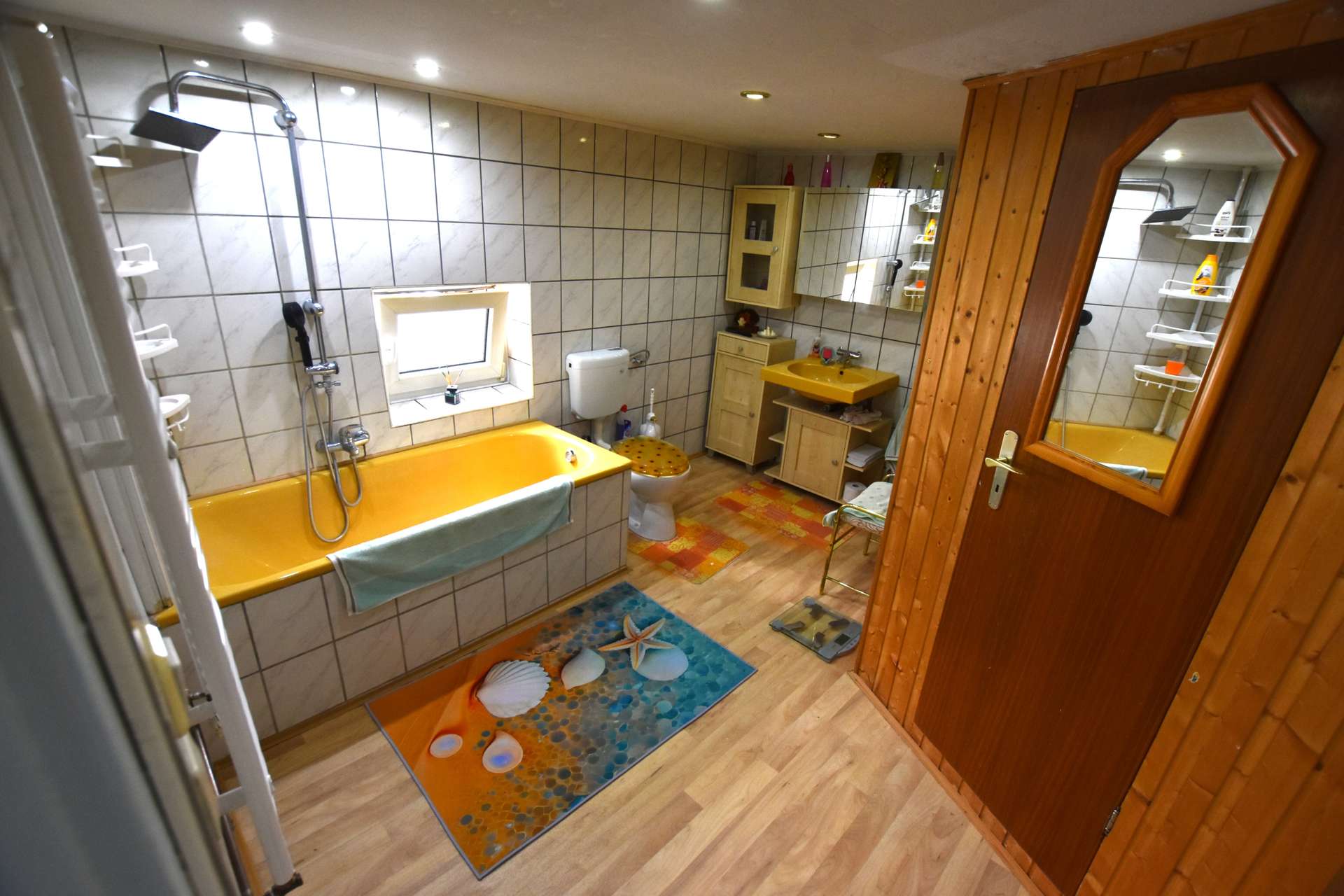 Ein echtes Highlight ist die hauseigene Sauna – perfekt für gesundheitsbewusste Eigentümer oder einfach zum Entspannen. Zwei Bäder, davon eines mit Badewanne und Sauna-Anschluss, sowie ein Gäste-WC mit Urinal sorgen für Komfort im Alltag. Beheizt wird die Immobilie über klassische Heizkörper.