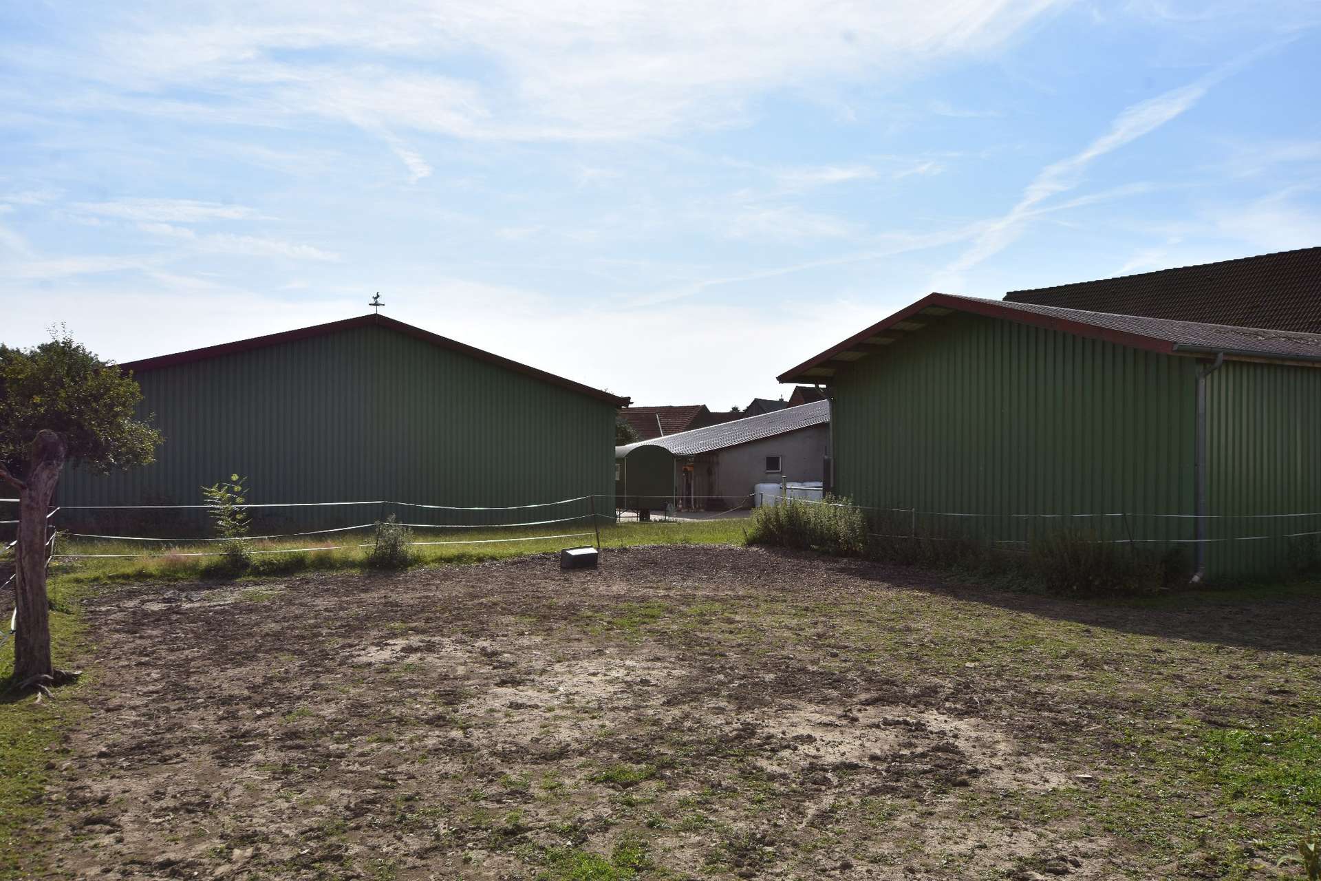 Den Haupthof durch eine überdachte Durchfahrt zwischen Scheune und Stallgebäude verlassend, gelangt man zum eigentlichen Pferdebereich. 3 zufriedene Pferde schauen auf der linken Seite aus einem Offenstall mit vorgelagerten 3 Einzelpaddocks heraus und genießen die Sonne und die Frischluft. Im Zentrum des Hinterhofes befindet sich die 1999 errichtete Reitanlage mit Reitbande, Licht und Musikanlage und Bewässerungstechnik in den Maßen 18 m x 40 m.