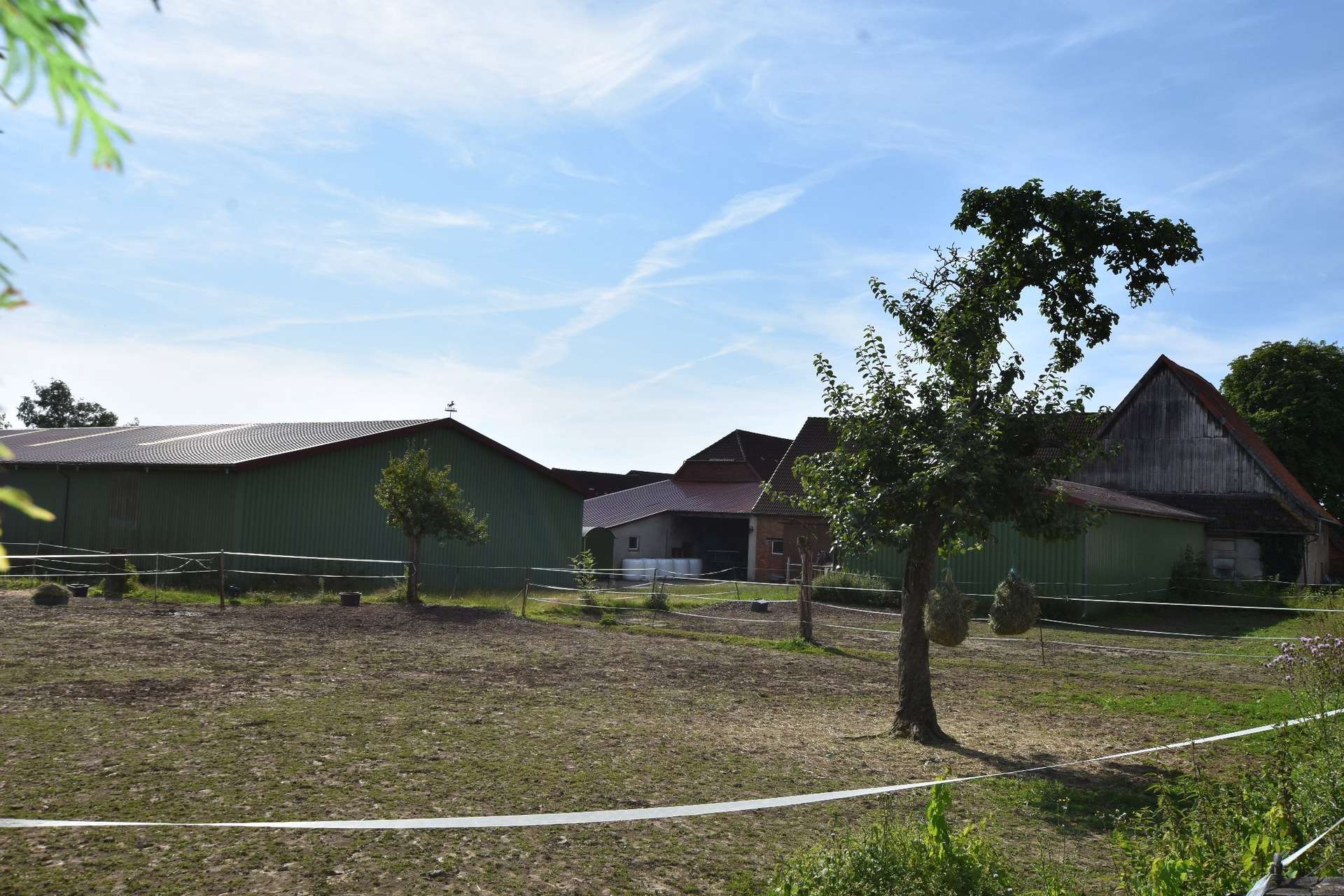 eine mit alten Bäumen bestückten zentralen Hofzufahrt. Auf der rechten Seite befindet sich das nahezu quadratische Haus in der Form einer „Kaffemühle“, wie dieser Gebäudetyp mit 2 geraden Etagen und einem Dachgeschoß im Norden liebevoll tituliert wird. Das Haus wird umgarnt durch einen schönen parkähnlichen Naturgarten. Hinter dem durch einen Laubbaum geprägten Rondell thront das Stallgebäude mit ca. 10 Pferdeboxen als zentraler Baukörper zwischen Wohnhaus und der sich links anschließenden Scheune. Sowohl das Wohnhaus als auch das Stallgebäude fielen einem Feuer zum Opfer und wurden daher 1933 im gleichen zusammenhängenden Stil neu errichtet. Die Scheune von 1948 auf der linken Seite beherbergt 8 Pferdeboxen und nimmt sowohl Stroh als auch Heuballen zu Lagerzwecken auf. Ein großes Raumvolumen ohne Zwischendecke sorgt für gute Luft für die Pferde.